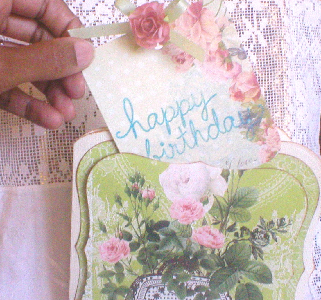 | Used Webster's Pages pp & journal card , cream cardstock, pink paper flower and green ribbon. Also used Grand Nestibilities shape. stamped and heat embossed blue sentiment and inked brown edges. |